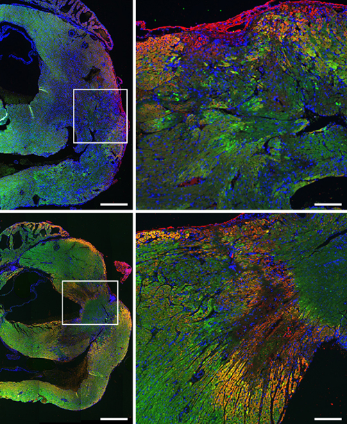 Heart attacks happen when the supply of blood to part of the heart muscle is cut off. Unless this supply is renewed quickly, the heart muscle cells start to die. Unlike skeletal muscle and other tissues that can recover from injury unscarred, heart muscle cells do not divide and do not replace dead cells with a new muscle. Instead, the heart’s fibroblasts (that is, fiber cells) divide rapidly in the damaged area and create a network of protein fibers that replace the damaged cells with scar tissue. This tissue ensures the integrity of the heart but reduces its ability to contract and pump blood. In the long term, therefore, a heart attack increases the chances of heart failure, a chronic condition in which the heart is incapable of meeting all the body’s needs, initially during physical exertion and later even while at rest. Heart failure affects around 64 million people around the world.